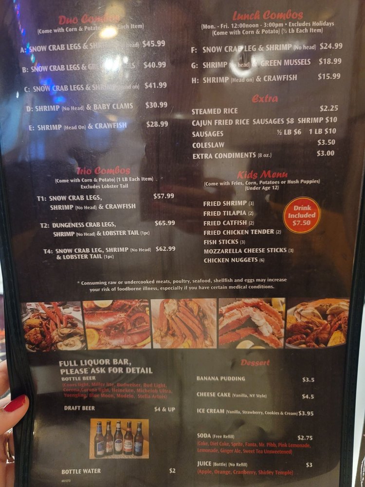 The menu highlights a variety of seafood boils, featuring succulent King Crab legs, lobster tails, and flavorful shrimp, all served steaming in seasoned bags alongside delicious accompaniments like potatoes and corn. Customers rave about the distinctive A+ special sauce that elevates each dish, ensuring a mouthwatering experience. Mark M. describes it as “the best food of any kind,” while others recommend their tasty crab ragoon and hush puppies.